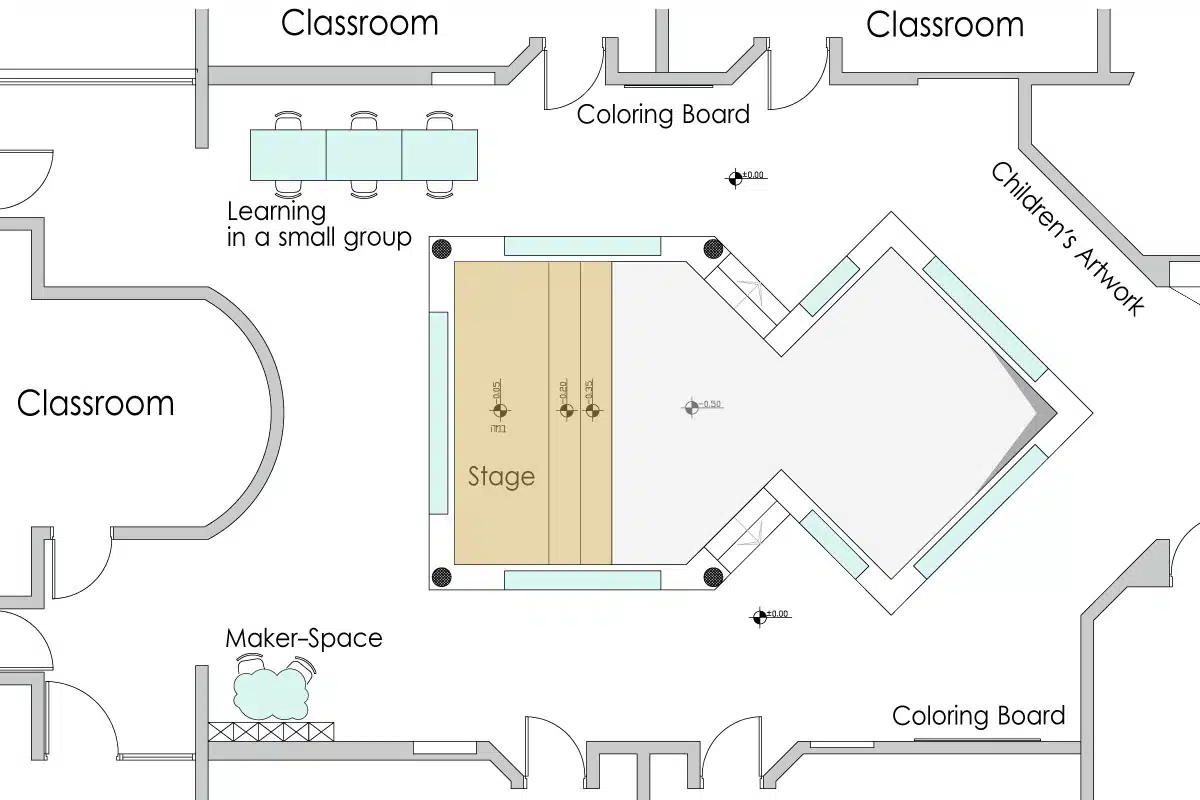 בתכנון המרחב הגדרתי למעשה 5 סביבות למידה ומשחק מגוונות. כל סביבת למידה מיישמת עקרונות פדגוגיים-אדריכליים מתוך 10 עקרונות העל לתכנון אדריכלי לילדים, עקרונות אותם גיבשתי במתודולוגיית העבודה שלי לאורך השנים: