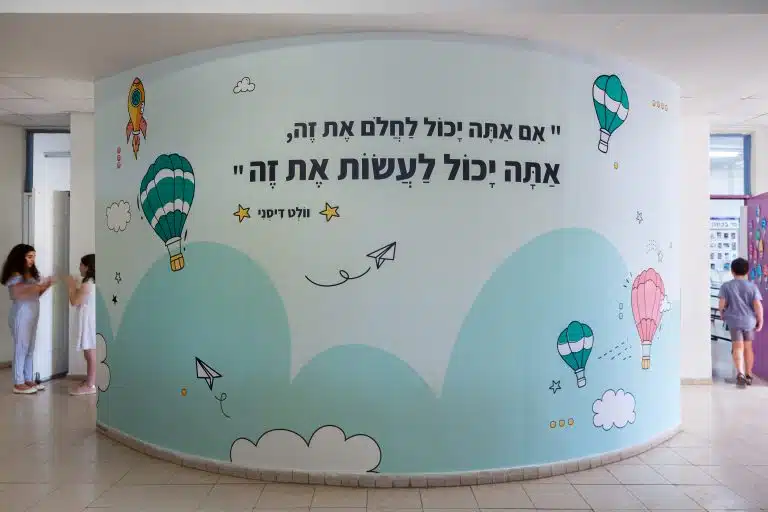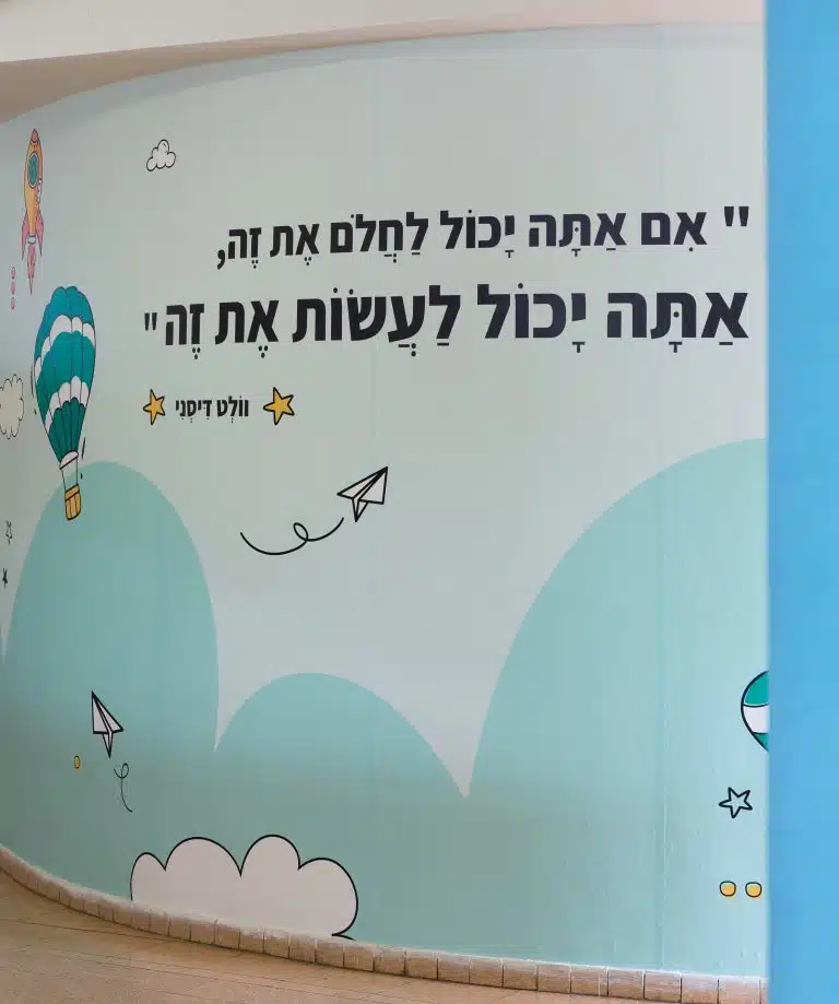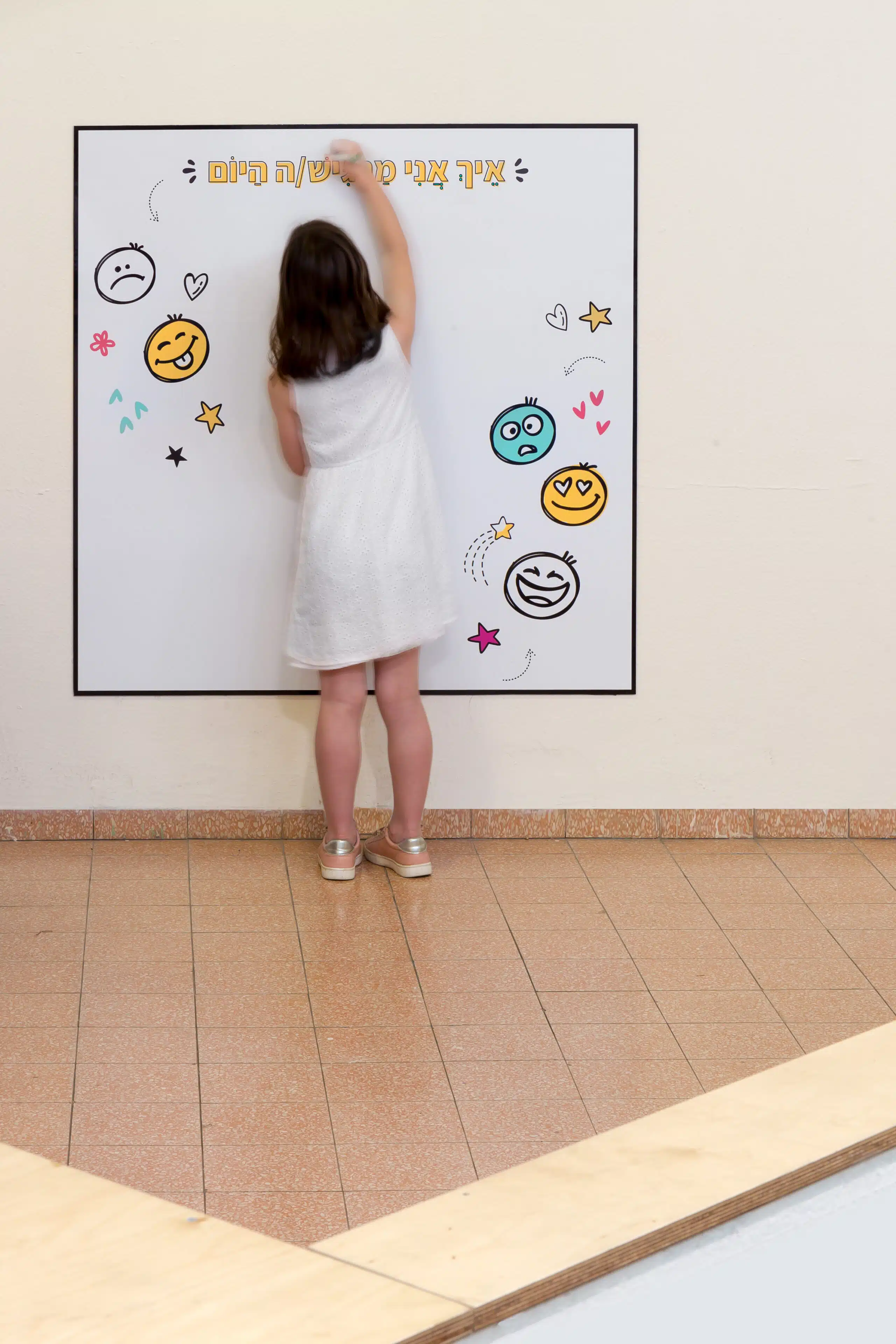 2. סביבת למידה המעודדת יצירתיות וביטוי אישי – אזורי תצוגה מגוונים המציגים את עבודותיהם של הילדים. לוחות מגנטיים מחיקים מעוצבים אשר מאפשרים לילדים לבטא את עצמם, לצייר ולתרגל כתיבת כתיבת אותיות באמצעות משחק. אחד הקירות הוגדר כ'קיר רגשות' הכולל משחק רגשות וכן לוח לביטוי ביטוי רגשות.
