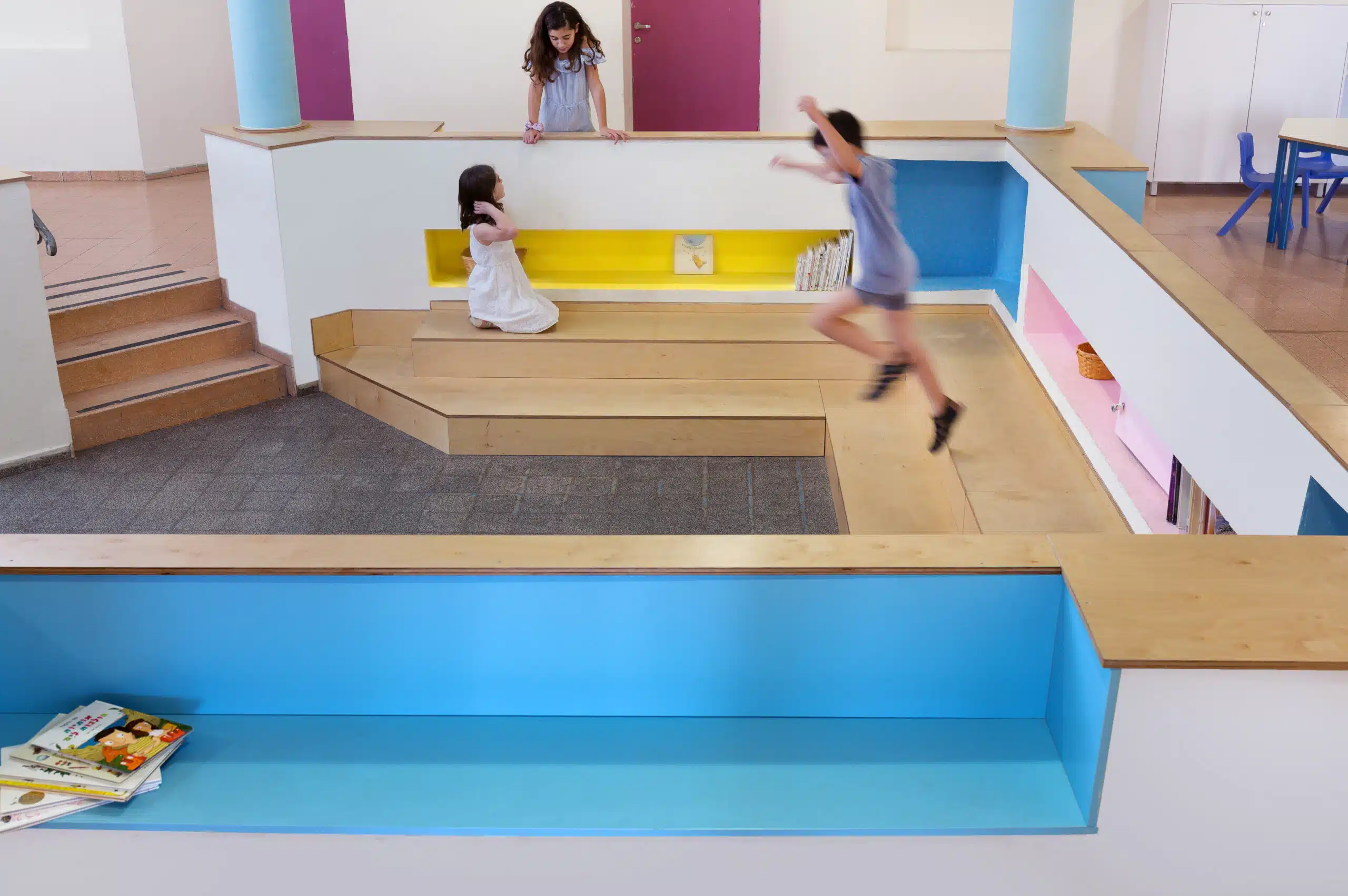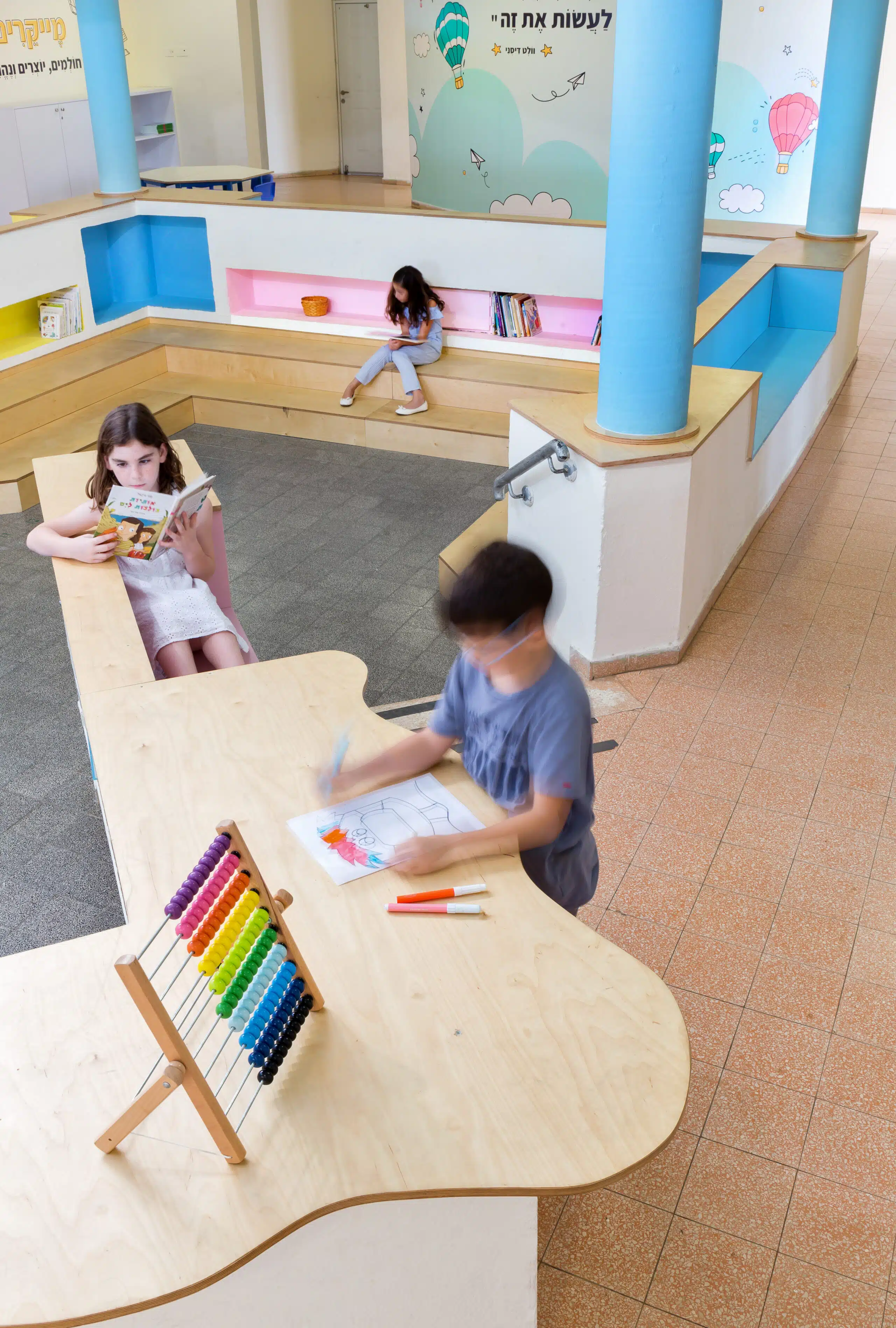 בכל המרחב בחרתי להשתמש בפלטת צבעים הרמונית וספסלי הישיבה חופו בלוחות עץ צבעוניים ומזמינים. המעקות חופו בלוחות עץ הבולטים ממישור הקיר ומשמים מעין שולחנות בר שילדים יכולים לגשת אליהם ולצייר.