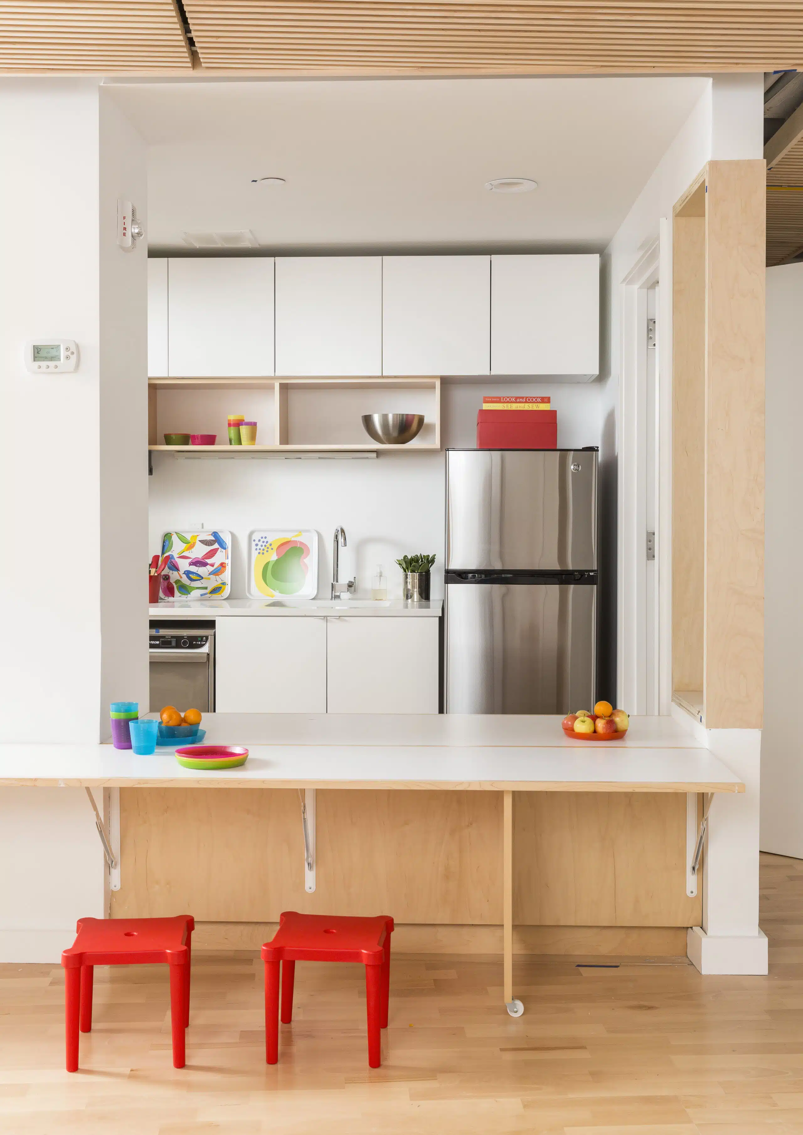 1.מטבח שהוא חווייה קולינארית – כשתכננו את גן הילדים Maple street היה חשוב לצוות החינוכי הנושא של התזונה והישיבה המשותפת של הילדים במהלך הארוחות, אז חשבנו שבמקום לתכנן עוד מטבח סטנדרטי שקיים בכל גן ילדים, שבו תהליך הכנת האוכל לא נעשה תמיד לעיני הילדים והאוכל פתאום מופיע באורח פלא, יש כאן הזדמנות להפוך את המטבח לאלמנט מרכזי בתכנון!